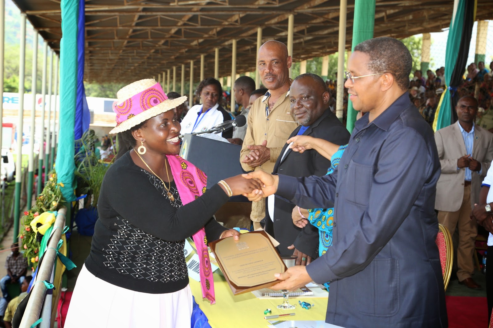 Waziri Maendeleo ya Jamii Jinsia na Watoto Mhe. Sophia Simba akimkabidhi Rais Kikwete tuzo maalum ya Wanawake kwa mchango wake mkubwa wa kujali maslahi yao